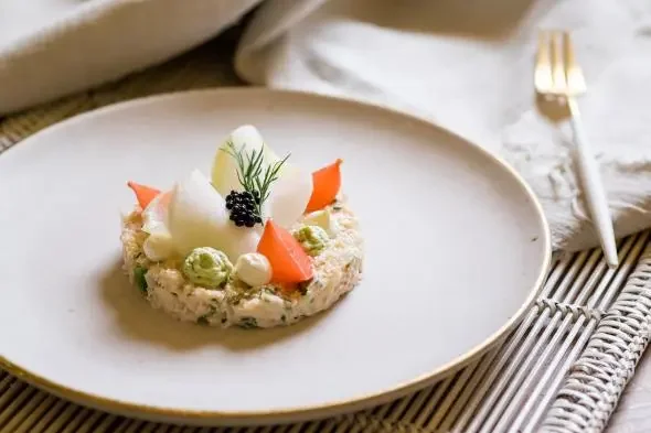 Peterhead haddock and prawn fishcake, tartare sauce, shaved fennel, chervil, spiced prawn oil